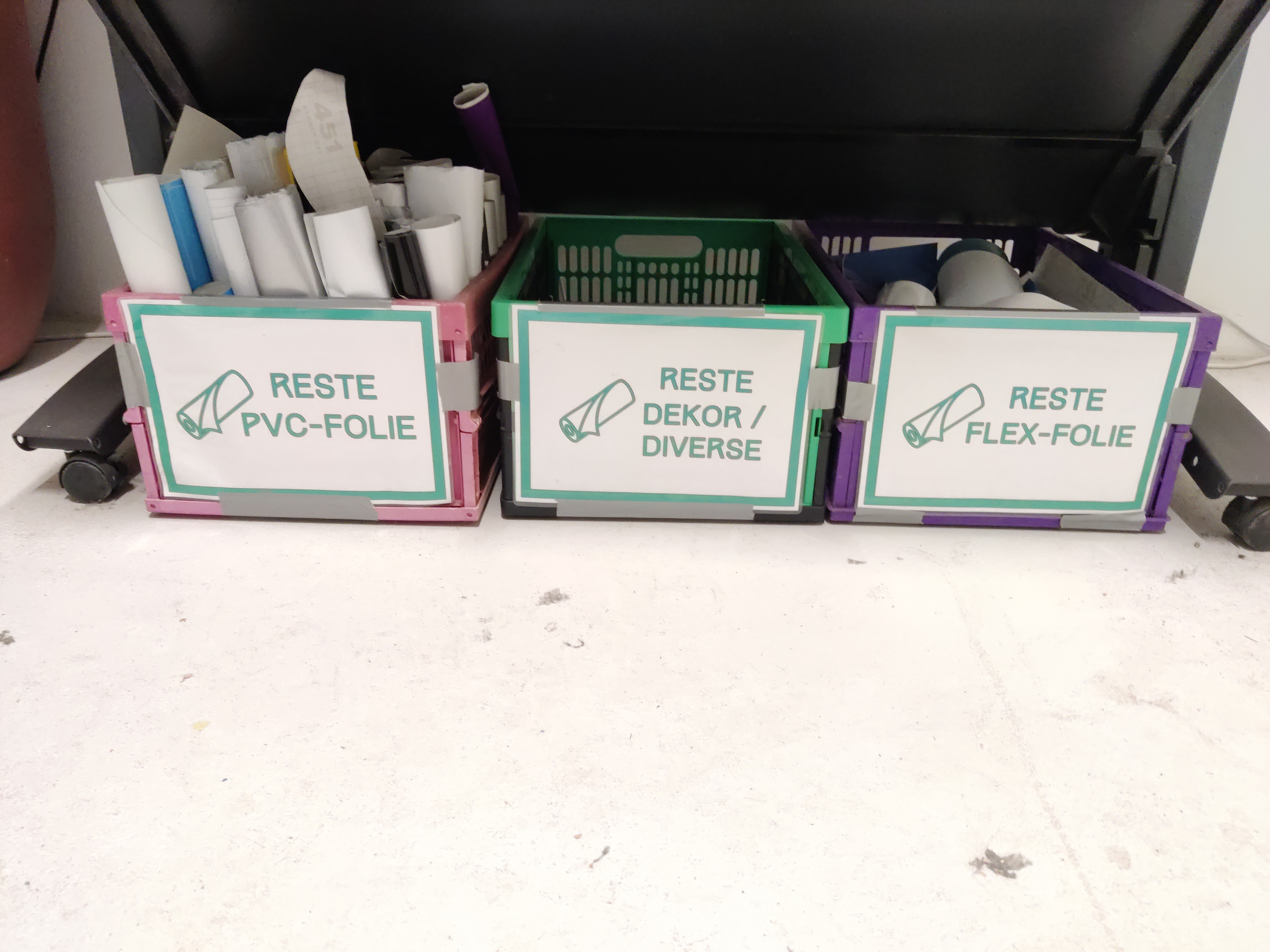 Übriges Material, was nicht mehr sinnvoll mit dem Plotter genutzt werden kann, kann in die unter dem DesignJet stehenden Restekisten einsortiert werden. Damit lassen sich noch kleinere Kunstwerke realisieren.