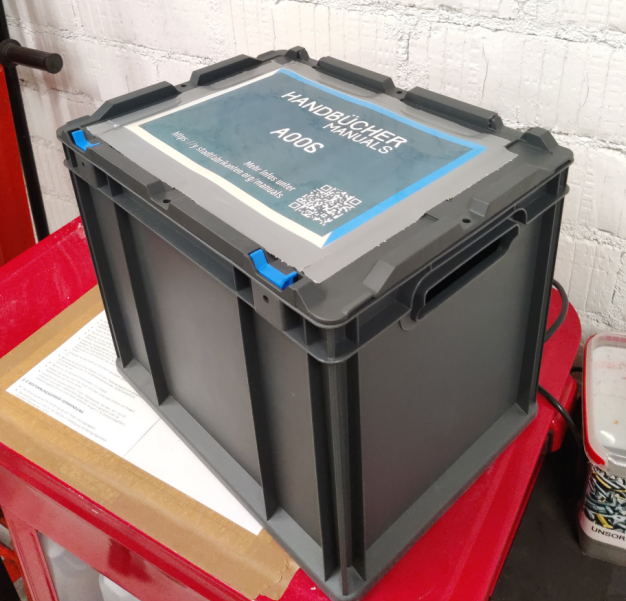 Seit Februar 2026 gibt es in jeder Werkstatt eine Eurobox mit Deckel, die für Handbücheraufbewahrung konzipiert ist. Darin finden sich die Handbücher für die im jeweiligen Raum relevanten Dokumentationen in Papierform. Parallel finden sich alle Handbücher auch digital in unserer Inventarplattform things.fablabchemmnitz.de.
