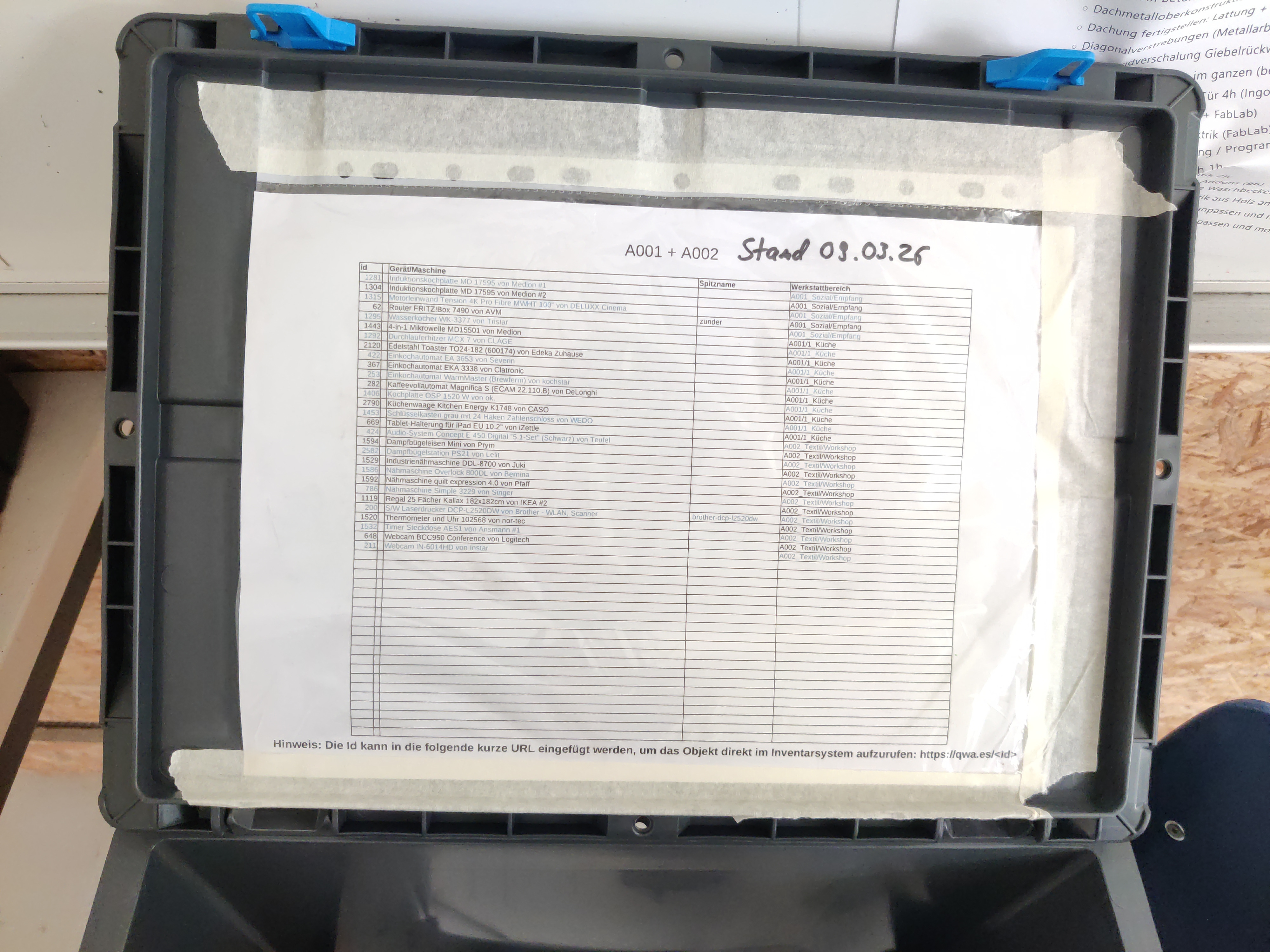 Id,Objekt,Spitzname,Werkstatt(unter)bereich, eine Überschrift mit Inhalt der Raumnummern, für die die Kiste genutzt wird, sowie ein Datum des Registerauszugs. - von innen: Ein Hinweis, dass alle