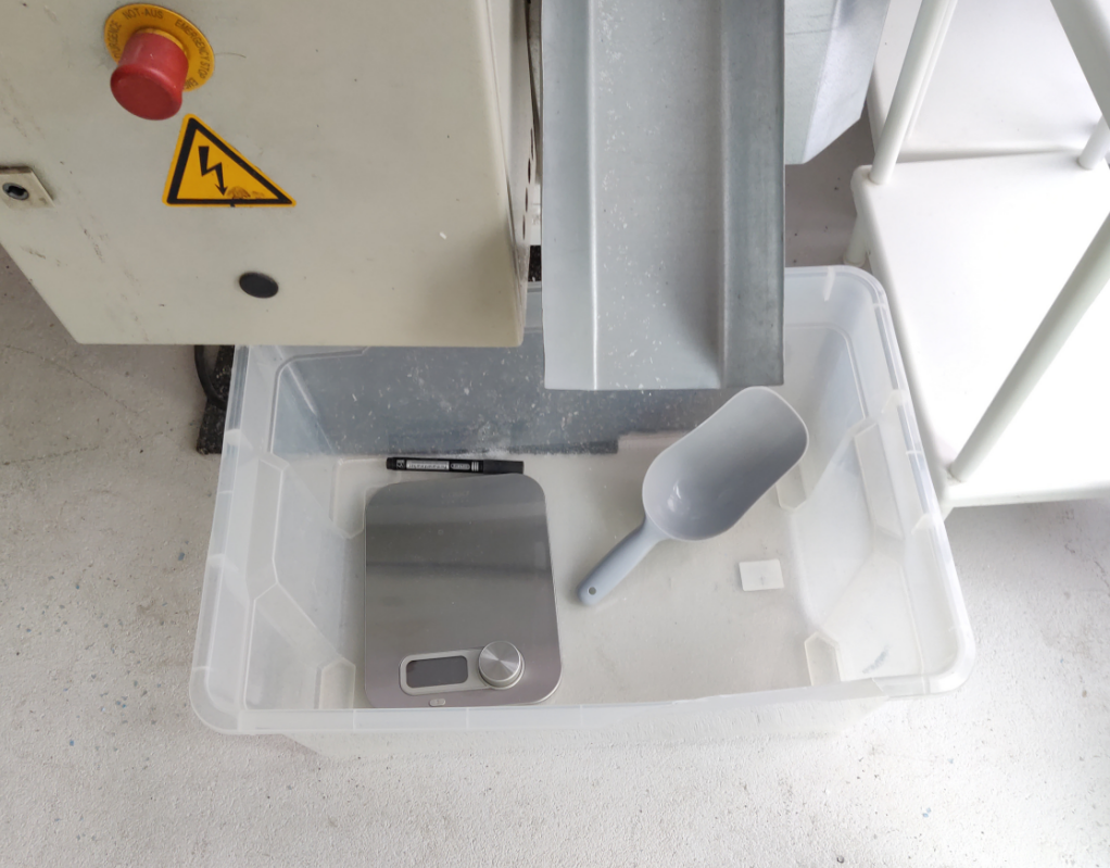 Das in die Kiste fallende Material kann auf einer Waage mit Hilfe eines kleinen Eimers und einer Schaufeln in Tüten gefüllt, gewogen und beschriftet werden. Das Beschriften ist besonders wichtig, damit es später noch korrekt zugewiesen werden kann.