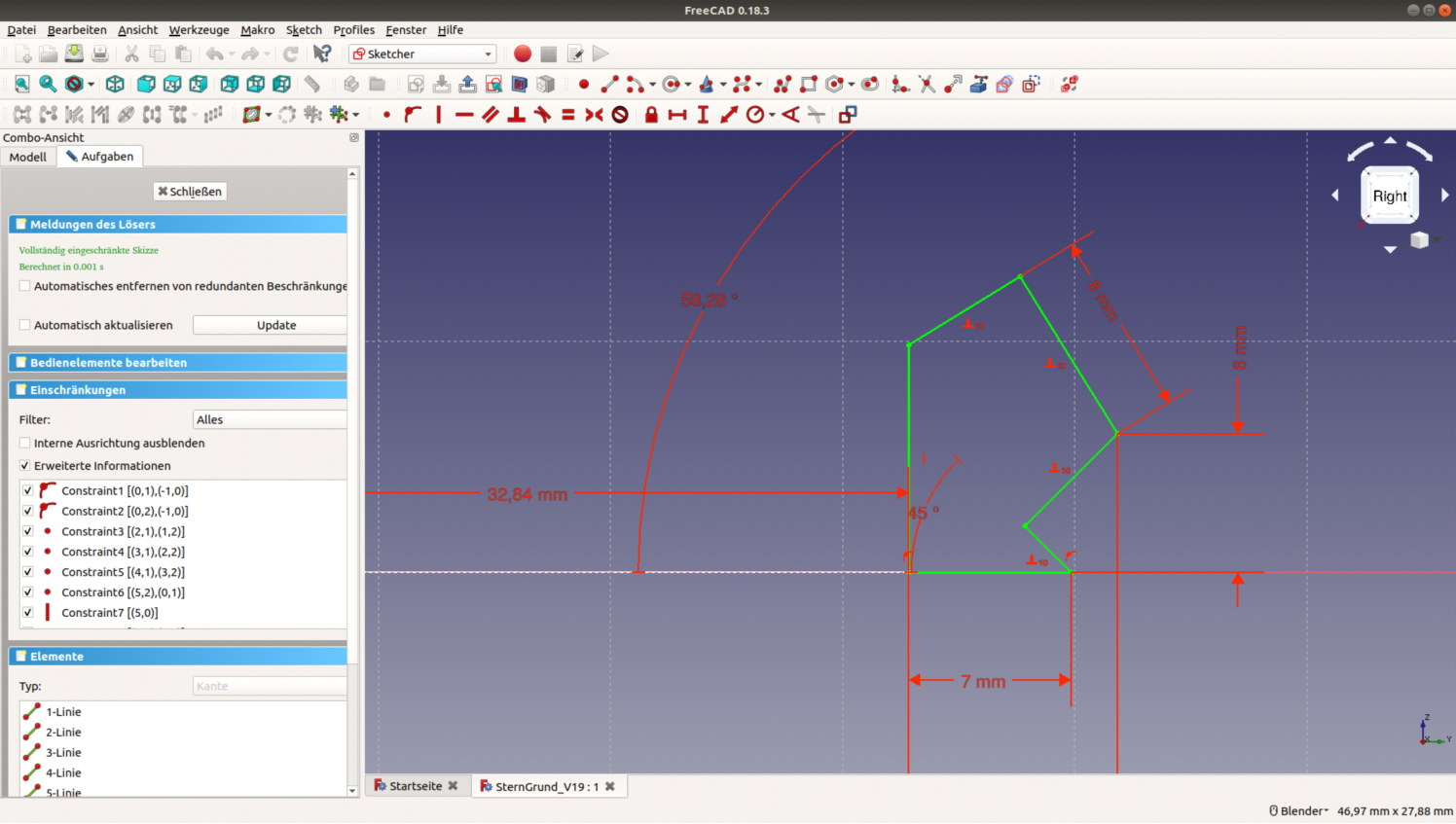 Für die Konstruktion muss der Winkel noch halbiert werden, da er auf beiden Seiten wirksam wird. Der verwendete Winkel beträgt $58,28° = \frac{116,57°}{2}$.
