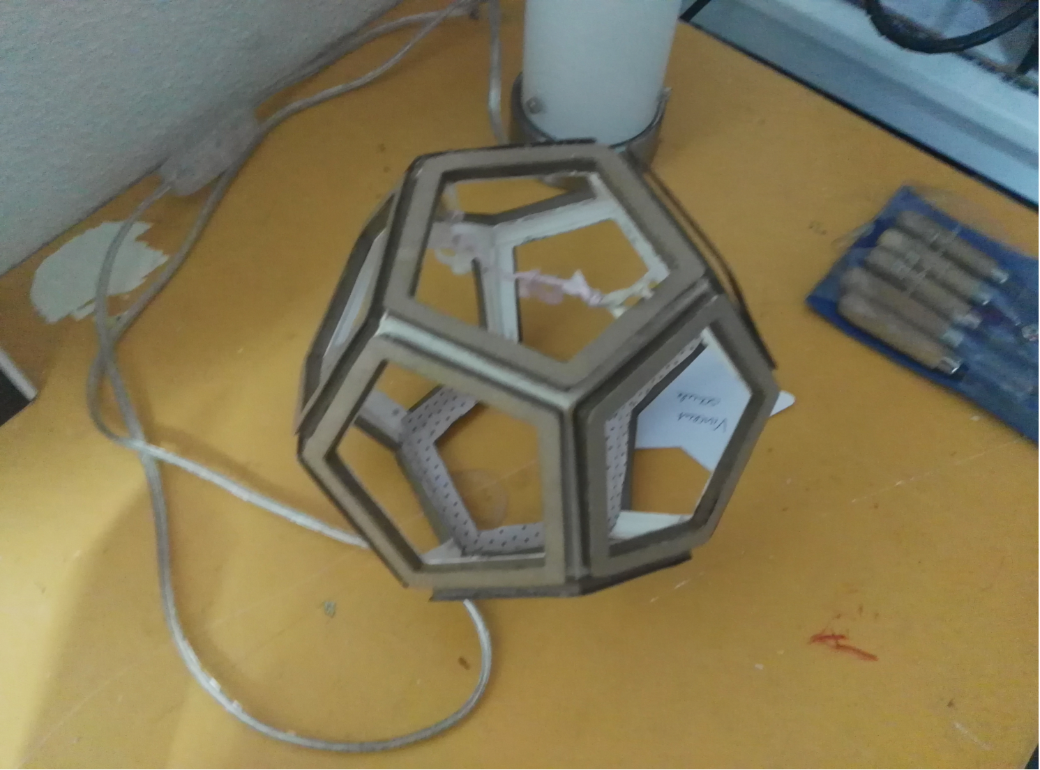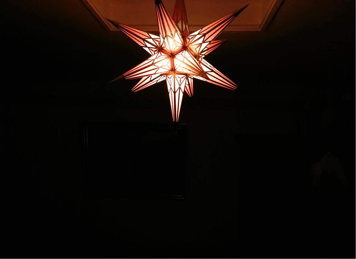 Der Stern besteht aus 12 fünfeckigen Spitzen und einem Gerüst aus Pappe, welches schon mehrfach verstärkt wurde.