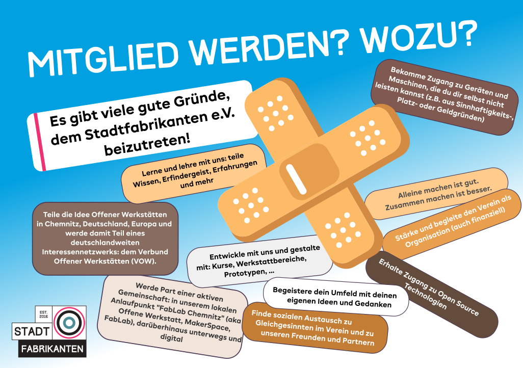 Es gibt viele gute Gründe, dem Stadtfabrikanten e.V. beizutreten! Wir bieten eine Plattform für Selbstbetätigung. Dazu bieten wir Platz an einem gut angebundenen Standort (Räume, Möbel), Infrastruktur (Heizung, Wasser, Strom, Internet), Materielles (Werkzeuge, Maschinen, Verbrauchsmaterialien) und Immaterialies Gut (Ideen, Netzwerk, Austausch).