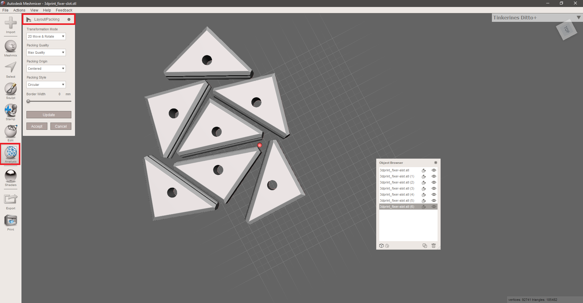 Bauteile verschachteln macht Sinn, um beispielsweise mehrere Bauteile auf engeren Raum anzuordnen. Diverse Slicer / 3D Druck Programme haben eine einfache Funktion zum automatischen anordnen. Leider sind diese Anordnungen meistens unschön. Es gibt ein paar wenige kostenfreie Programme, um diesen Job zu übernehmen. Auf dieser Seite finden sich Erläuterungen und nutzbare Programme. Insbesondere für SLA/SLS/DLP/FDM 3D-Drucker kann ein 3D Bin Packing Vorteile bringen. Das 3D Packing ist äußerst rechenintensiv und erfolgt über Anäherungsberechnungen