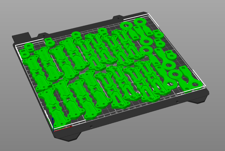 Ein Beispielvergleich zwischen Plater und PrusaSlicer. Der Versuch 8x Riffy (ein kleiner Schlüsselorganizer, bestehend aus 4 Teilen) zu importieren und vollständig auf das Bett zu verteilen wie folgt: